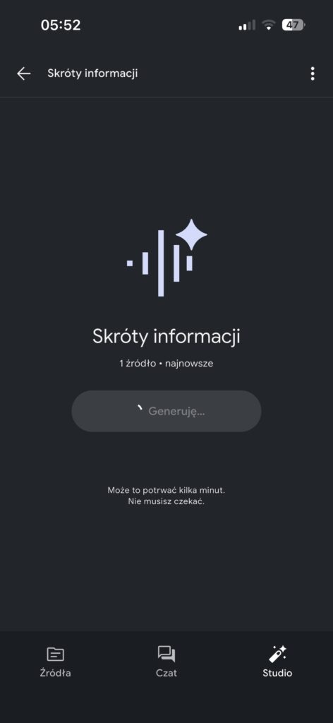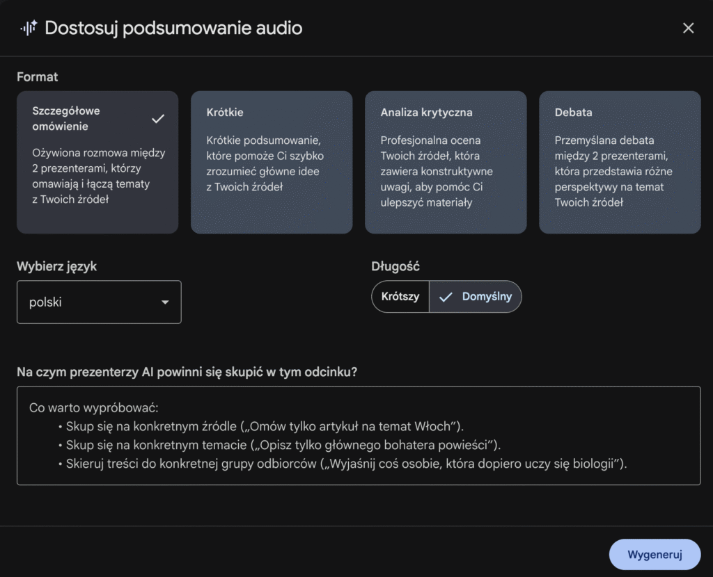 Jak to działa? Bardzo prosto. Tworzę notatnik w NotebookLM, do którego wrzucam linki interesujących mnie źródeł, np. artykułów lub filmów na YouTube. Następnie przechodzę do zakładki Studio i tam dostosowuję moje podsumowanie audio. Określam kilka parametrów przez napisanie krótkiego prompta z instrukcją, jak ma brzmieć audio. Na koniec naciskam przycisk wygeneruj i w zaledwie kilkanaście minut otrzymuję gotowe audio, które mogę odsłuchać w dogodnej dla mnie chwili.