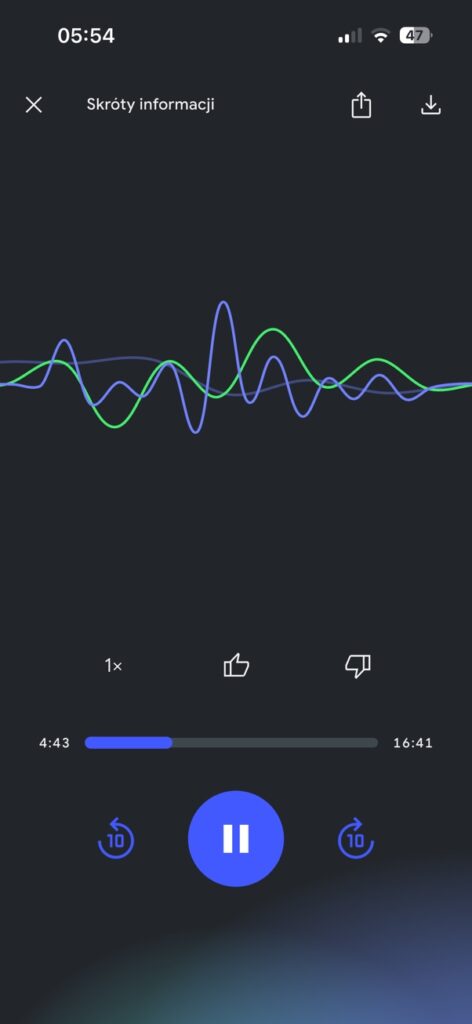 🔹 Lepiej rozumiem treść – wygenerowane audio daje mi możliwość przesłuchania go w formie dyskusji dwóch głosów AI.