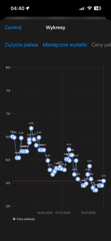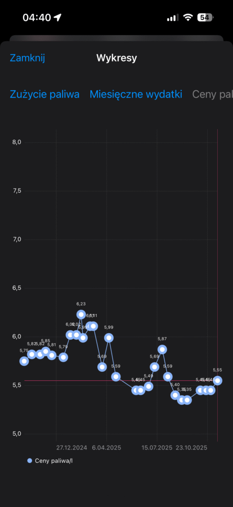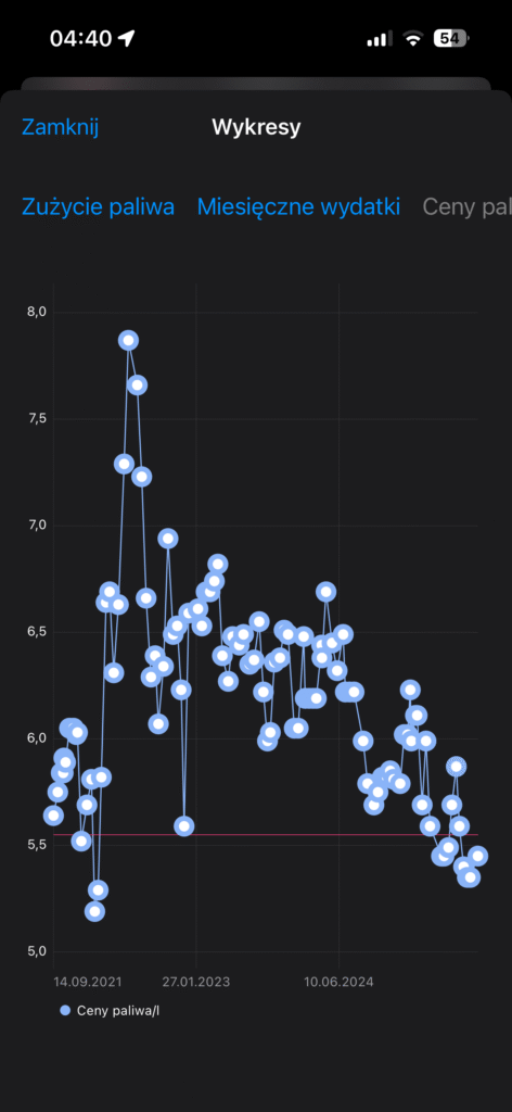 • Taka ciekawostka – zmiany cen paliwa 95 w czasie. Wykresy z aplikacji Fuelio (iOS).