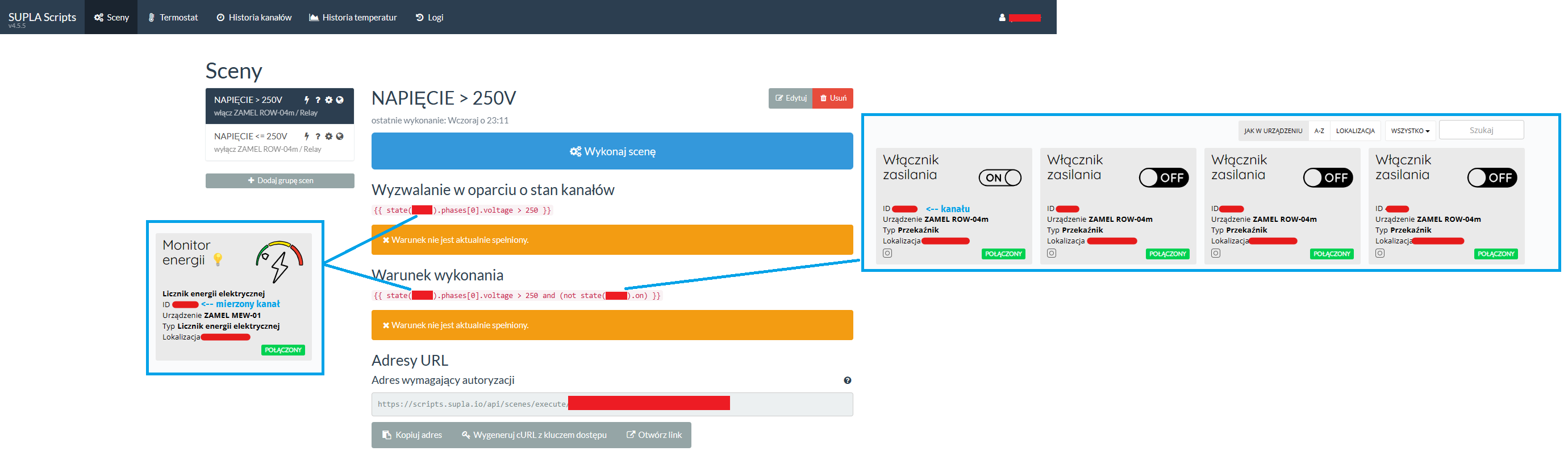 Warunek wykonania sceny: {{ state(ID KANAŁU POMIAROWEGO MEW-01).phases[0].voltage <= 250 and (state(ID KANAŁU ODBIORNIKA ROW-04m).on) }}