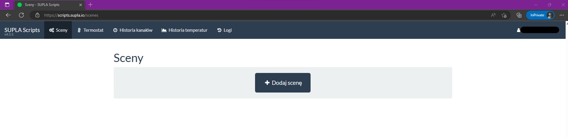 1. Logujemy się do naszego konta SUPLA Scripts, a następnie po poprawnym połączeniu dodajemy pierwszą scenę w zakładce Sceny. Nasza pierwsza scena będzie sprawdzała mierzone napięcie przez urządzenie MEW-01 na fazie nr 1. Podstawowe założenia do uruchomienia sceny: